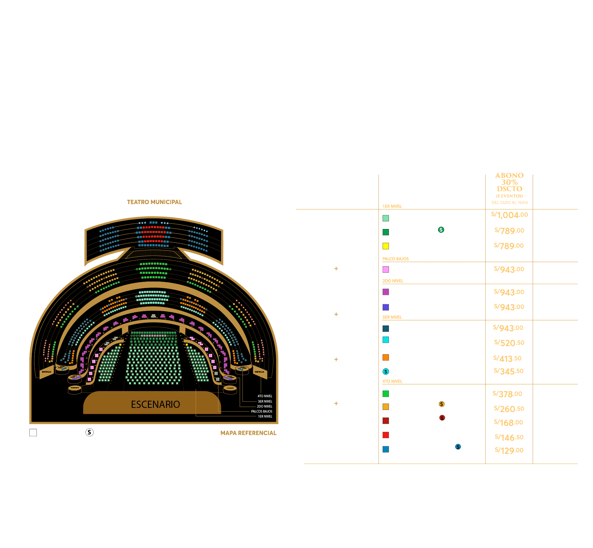 - Abono exclusivo para eventos del Teatro Municipal: CONCIERTO EVELINO PIDO CON ORQUESTA; ÓPERA IL TROVATORE; ÓPERA TANCREDI; ÓPERA ATAHUALPA; ÓPERA CAVALLERIA PAGGLIACI.
