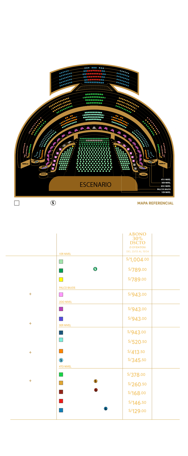 - Venta Abono: 30% De dscto. con cualquier medio de pago, valido del 23 de marzo desde el medio día, hasta el 15 de abril.