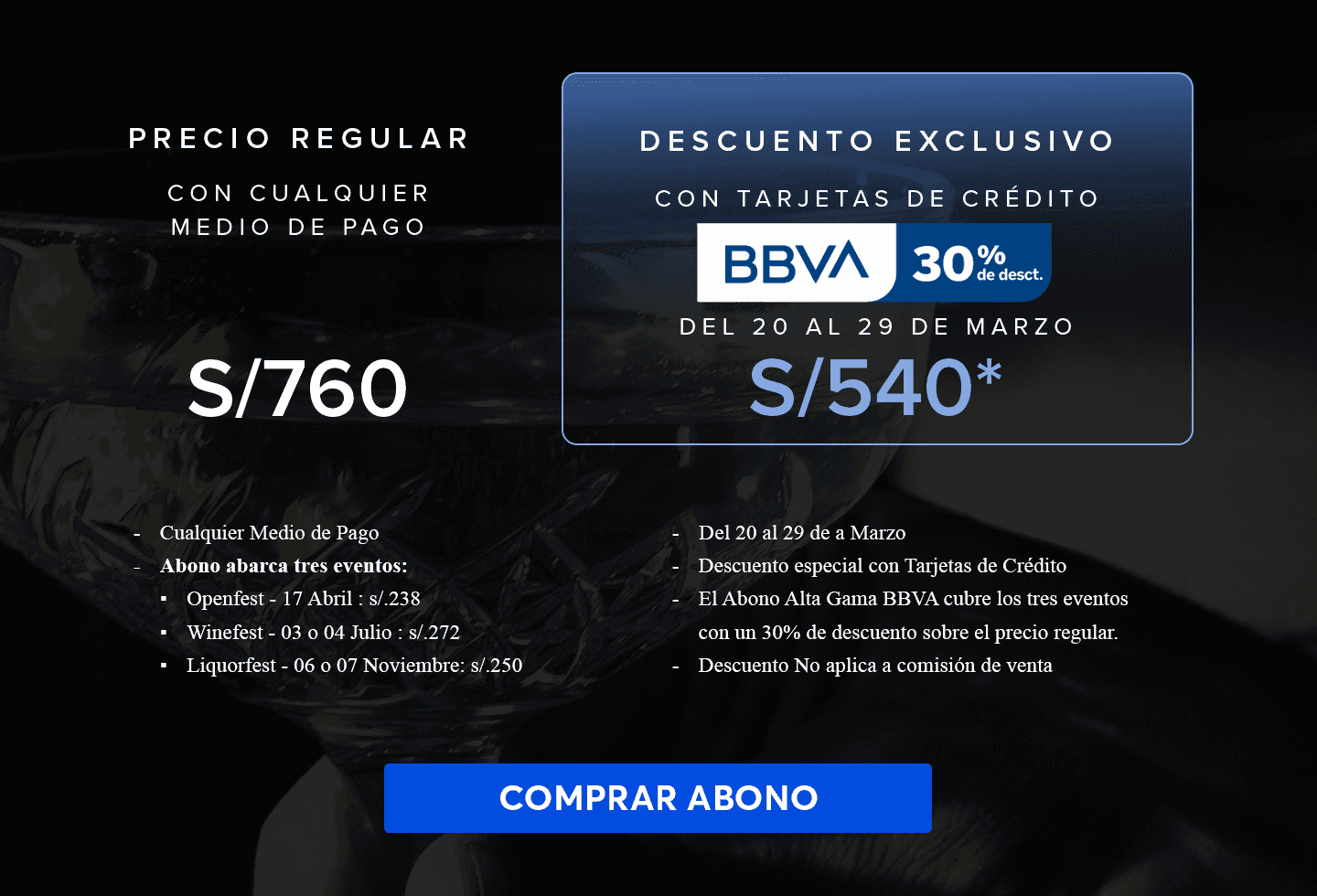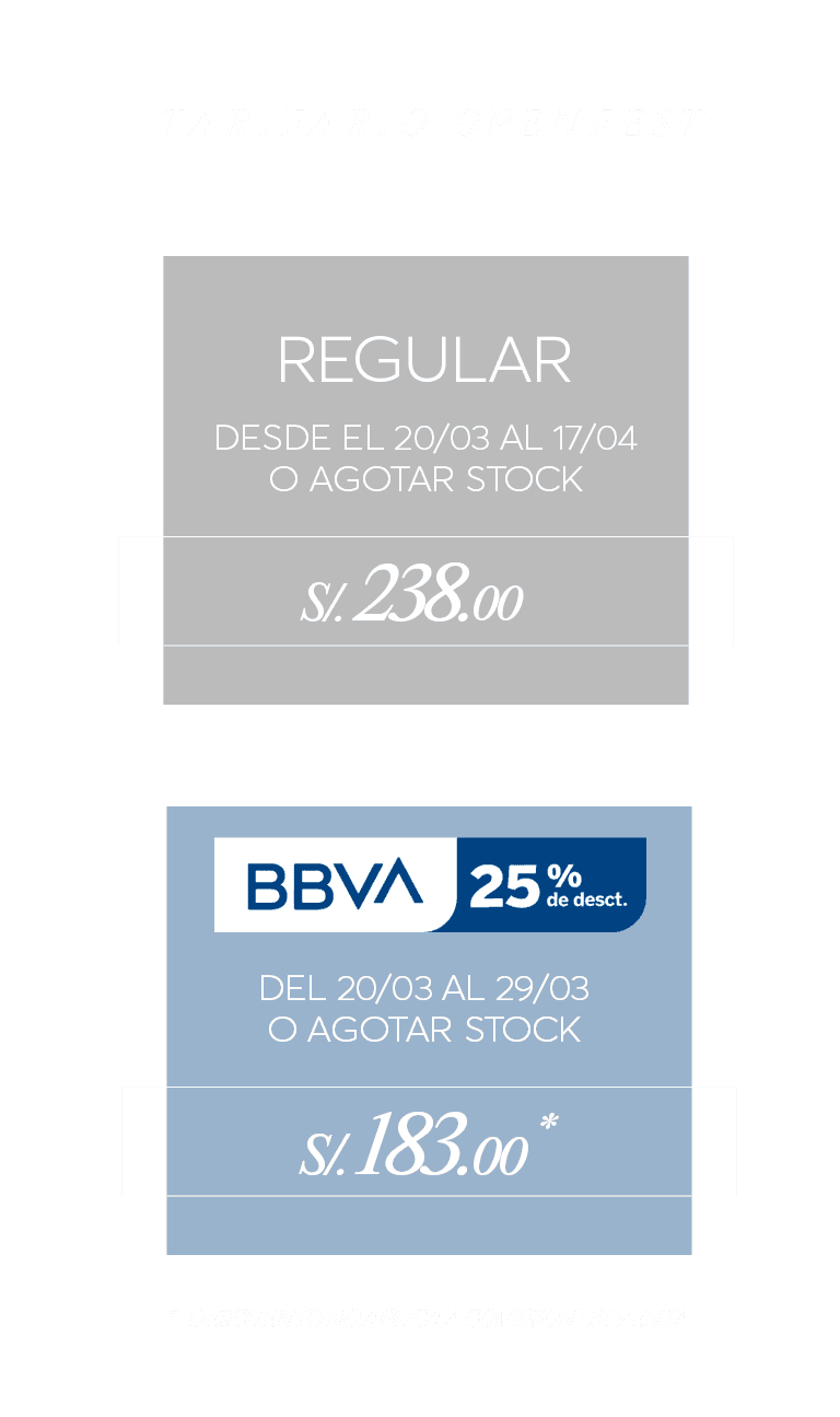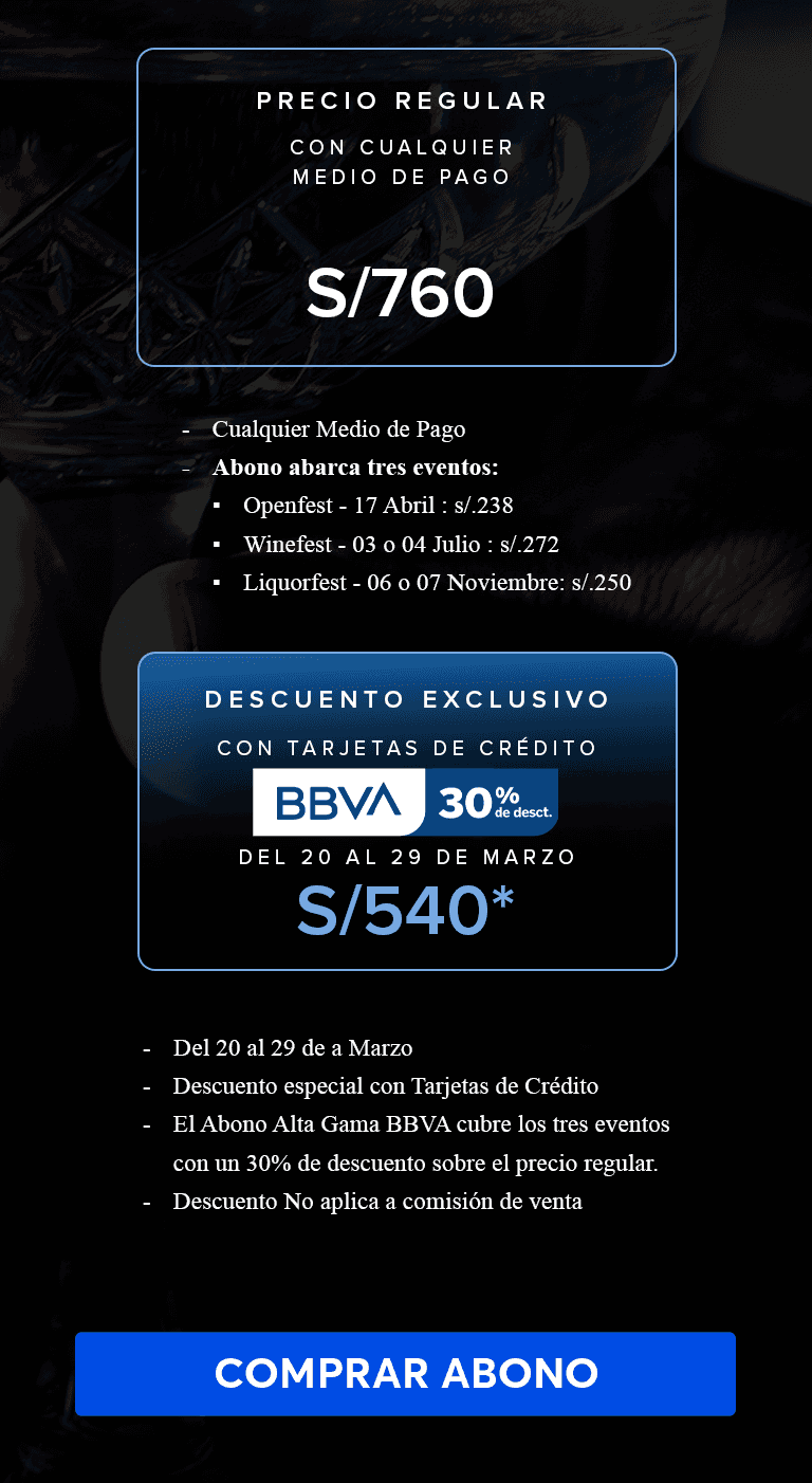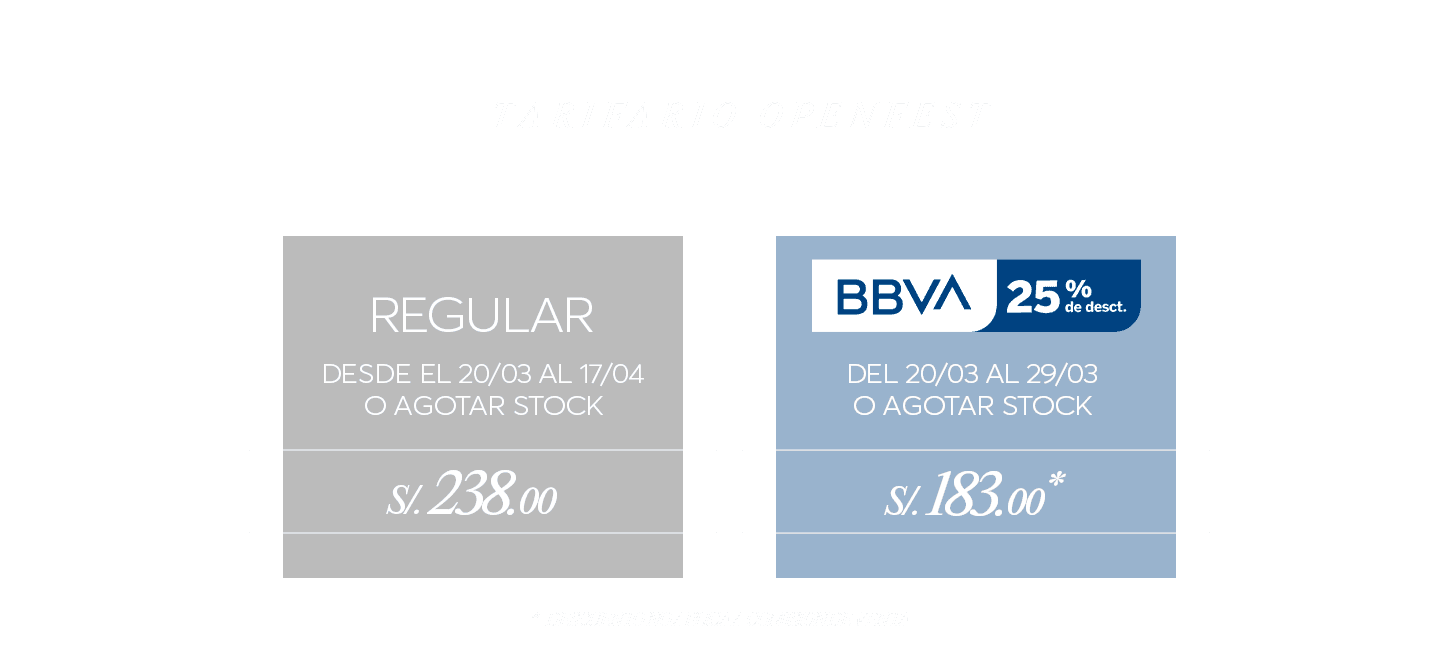 - PREVENTA BBVA 25% DE DESCUENTO: Promoción válida del 20 al 29 de marzo de 2026. Stock: 200 entradas.Aplica para pagos con Tarjeta de Crédito BBVA.25% de descuento en entradas para el Openfest 2026.Openfest 2026 (Viernes, 17 de abril de 2026).Válido para comprar durante la vigencia de la promoción.Compra máxima: hasta 4 entradas por cliente. Válido para compras a través de: www.ticketmaster.pe. El descuento no incluye comisión ticketera. Evento exclusivo para mayores de 18 años.El desarrollo del evento es responsabilidad del organizador: WINE FEST S.A.C., RUC N° 20536516582.No acumulable con otras promociones y/o descuentos.No aplica para pagos con Tarjeta Prepago BBVA, Empresarial, Corporativo y Capital de Trabajo.Imágenes referenciales.TOMAR BEBIDAS ALCOHÓLICAS EN EXCESO ES DAÑINO.