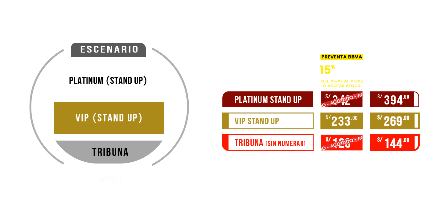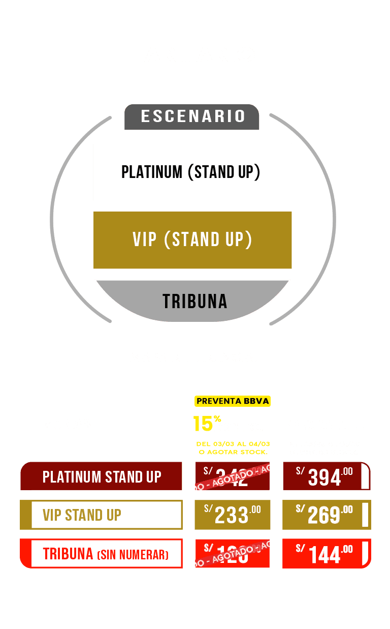 - Condiciones: Preventa exclusiva del 03 y 04 de marzo de 2026 y/o hasta agotar stock. 15% de descuento en las entradas a Arcangel pagos con Tarjeta de Crédito y Débito BBVA. Stock 12,000 entradas, distribuidas de la siguiente manera: Platinum (4,000),Tribuna (4,000) y Vip (4,000). Válido para compras online en https://www.ticketmaster.pe/ y en centros de experiencia Ticketmaster. Precios publicados en la web de Ticketmaster. Fecha y lugar de evento: 12 de septiembre del 2026, en el Estadio San Marcos, Lima. Compra máxima por persona: 06 entradas. Una producción de Shows & Sports Entertainment S.A.C. RUC: 20612150169. Los precios incluyen comisión de ticketera e impuestos de ley. El desarrollo del evento es responsabilidad del organizador, BBVA actúa como intermediario, por lo que no tendrá responsabilidad legal por cualquier daño o perjuicio, así como cualquier eventualidad que impida la realización.