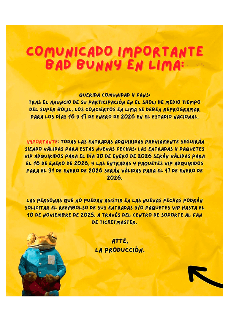 - Gracias por adquirir un Paquete VIP Bad Bunny. Los detalles del paquete y la producción de la gira están sujetos a cambios sin previo aviso. Las entradas se distribuirán según el método de entrega elegido. Los artículos de merchandising incluidos en el paquete se podrán recoger el día del espectáculo en el lugar designado para el registro VIP (o en cualquier otro lugar designado del recinto). Recogida sólo el día del evento. LA INFORMACIÓN SOBRE EL LUGAR Y LA HORA DE REGISTRO SE ENVIARÁ POR CORREO ELECTRÓNICO A vipnation@engage.ticketmaster.com ENTRE 3 Y 5 DÍAS ANTES DEL ESPECTÁCULO. Si no la ha recibido 3 días antes del espectáculo, póngase en contacto con nosotros inmediatamente (info@vipnation.com). Todos los paquetes son NO REEMBOLSABLES Y NO TRANSFERIBLES. Todas las ventas son definitivas. Deberá presentar un documento de identidad con fotografía válido que coincida con el NOMBRE DEL COMPRADOR en este pedido. Aquellos que no puedan presentar una identificación con foto que coincida con el nombre del COMPRADOR en el pedido serán rechazados. Es posible que tenga que firmar un documento de exención de responsabilidad. Si tiene alguna pregunta sobre la compra de entradas o no ha recibido el correo electronico ingrese aqui https://help.ticketmaster.pe/hc/es-419/requests/new?ticket_form_id=16218539154449. Los paquetes VIP de Bad Bunny NO PUEDEN REVENDERSE NI TRANSFERIRSE. Todos los elementos del paquete perderán su validez si se revenden o transfieren. Por favor, consulte con el lugar directamente para cualquier restricción de edad. Si tiene necesidades ACCESIBLES: llame o envíe un correo electrónico a nuestros representantes de atención al cliente en cuanto haya realizado su pedido, y haremos todo lo posible por satisfacer sus necesidades en función de la disponibilidad. Si tiene alguna pregunta sobre los paquetes VIP, envíe un correo electrónico a info@vipnation.com o llame al 888-458-8297.