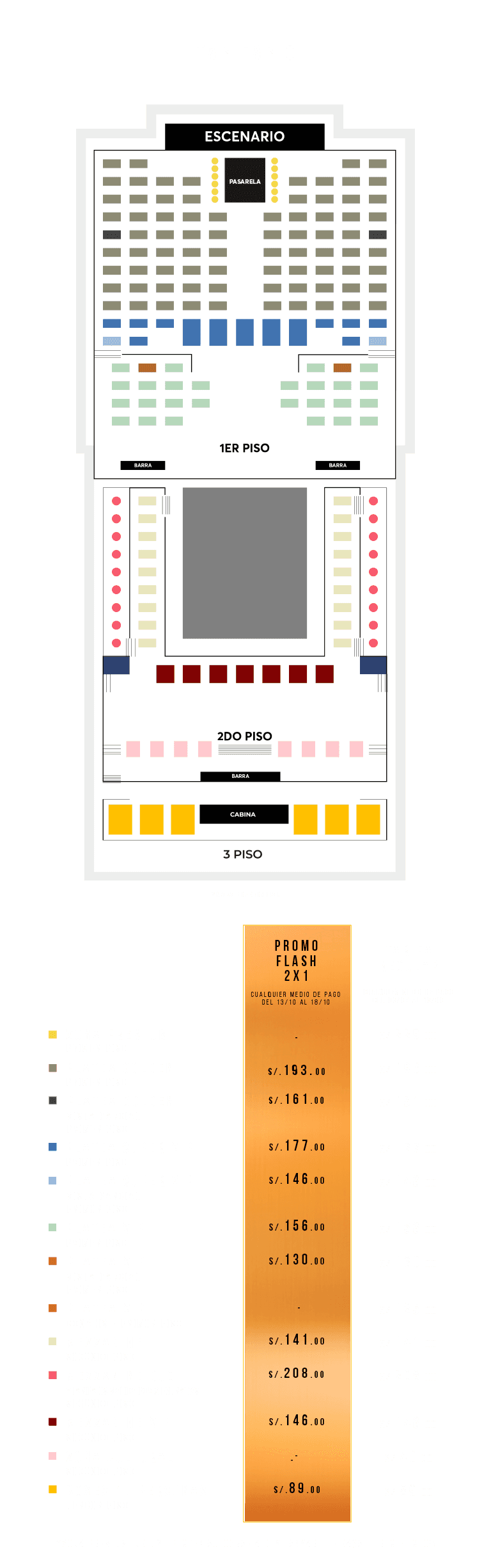 - Todos los asientos son numerados, distribuidos de la siguiente manera: Zona Premium (12), Platea Golden (312), Platea Golden Vista Parcial (8), Platea Super Vip (82), Platea Super Vip Vista Parcial (8), Platea Vip (104), Platea Vip Vista Parcial (8), Platea Vip (conadis) (8), Mezzanine 1 (72), Mezzanine Duo (36), Mezzanine VIP (70), Zona Cultural (vista parcial) (32), Box 10 personas (60).