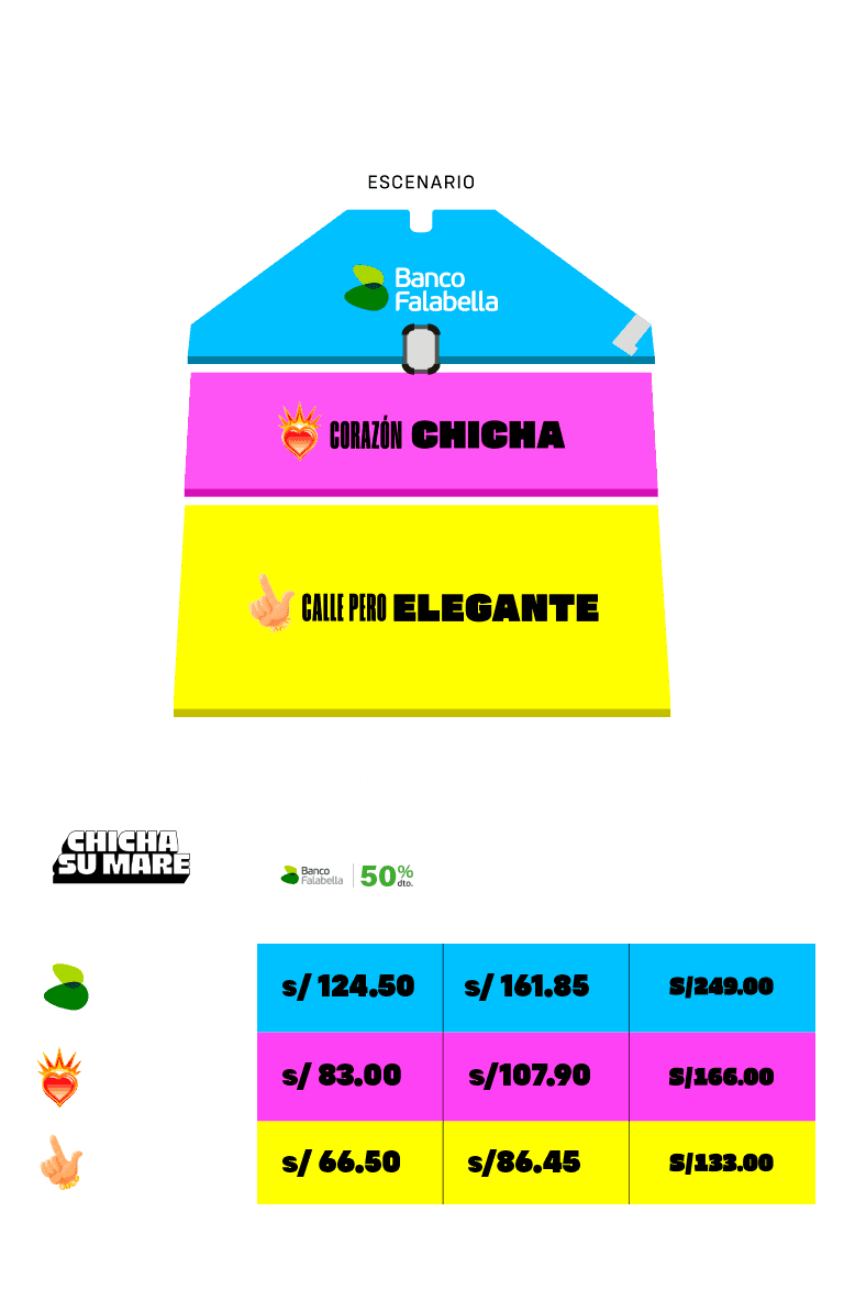 - **Capacidad Tarifa regular: **Zona Banco Falabella (3,000), Zona Corazón Chicha (4,500) y Zona Calle pero Elegante (7,500)