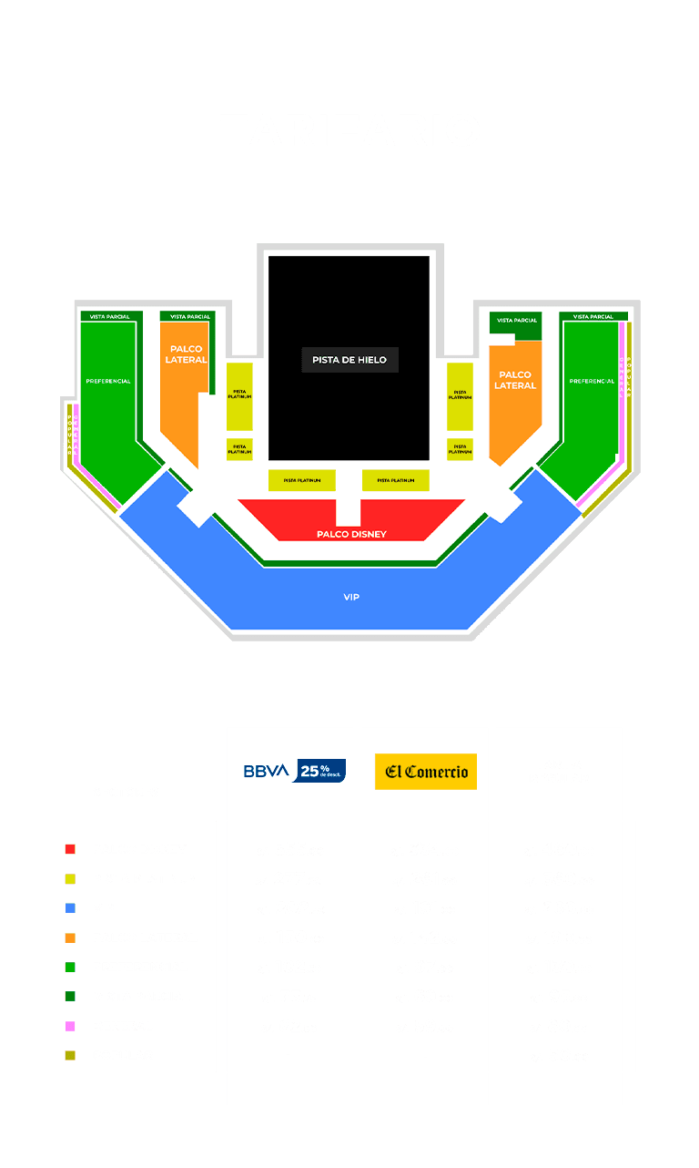 - Condiciones: Preventa exclusiva del 16 al 18 de mayo de 2025 y/o hasta agotar stock. 20% de descuento en las entradas para Disney on ice para pagos con Tarjeta de Crédito y Débito del BBVA. Stock 965 entradas por función, distribuidas de la siguiente manera: Palco Disney (96), Pista Platinum (75), Vip (297), Palco Lateral (80), Preferencial (237), Vista Parcial (103), General (58) y Popular (19). El descuento es aplicado al valor de la entrada mas no a la comisión de ticketera. Válido para compras online en ticketmaster.pe. Precios, funciones y horarios publicados en la web de Ticketmaster. Fecha y lugar de evento: Del 5 al 10 de septiembre, en el Coliseo Eduardo Dibós. Compra máxima por persona: 6 tickets. Ingresan a partir de 1 año, acompañados de un adulto responsable de su seguridad, cada uno con su entrada en el mismo sector. Una producción de Show y Sports Entertainment S.A.C. RUC 20612150169. Los precios incluyen comisión de ticketera e impuestos de ley. El desarrollo del evento es responsabilidad del organizador, BBVA actúa como intermediario, por lo que no tendrá responsabilidad legal por cualquier daño o perjuicio, así como cualquier eventualidad que impida la realización.