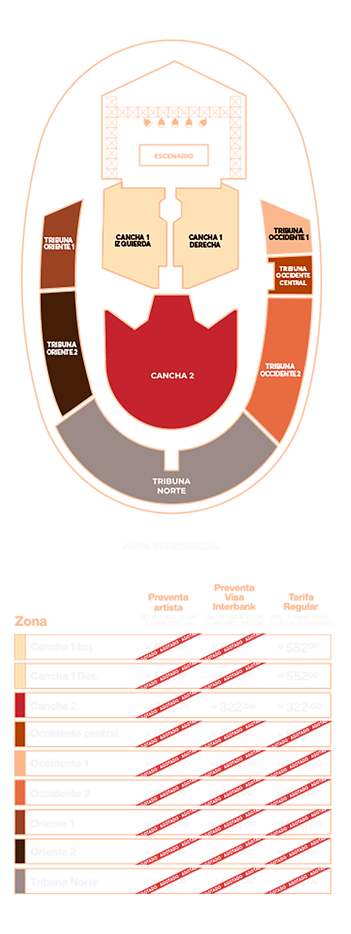 - Preventa IBK VISA: Válida para Tarjetas de Crédito y Débito Visa Interbank. Excepto Tarjetas Empresariales ni Rappicard. Válido para comprar en la web https://www.ticketmaster.pe/. Preventa con Visa Interbank del Del 08 de abril a las 10:00 am al 10 de abril a las 8:59 am o hasta agotar stock. Stock máximo Visa Interbank: 21,988 entradas. Distribuidas: Cancha 1 (6,035), Cancha 2 (6,150), Occidente Central (275), Occidente 1 (1,113), Occidente 2 (1,265), Oriente 1 (1,750), Oriente 2 (1,550) y Tribuna Norte (3,850). Los precios incluyen comisión de Ticketmaster. El desarrollo del evento es responsabilidad del organizador. Interbank no será responsable por cualquier eventualidad que impida la realización del evento o cualquier reclamo en general. Consulta tasas de interés, comisiones, gastos y penalidades en el Tarifario, en Tiendas Interbank o en www.interbank.pe, conforme a la normativa vigente.