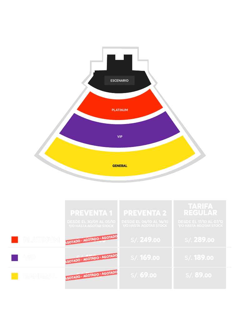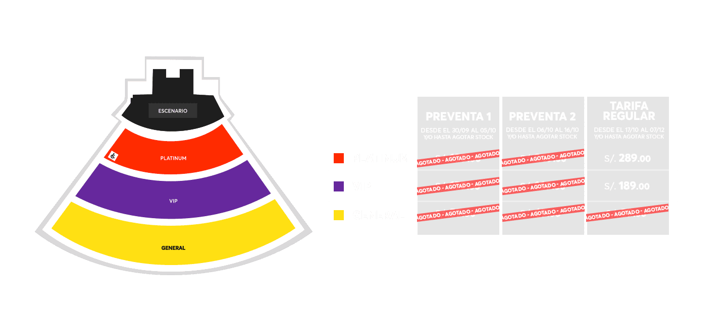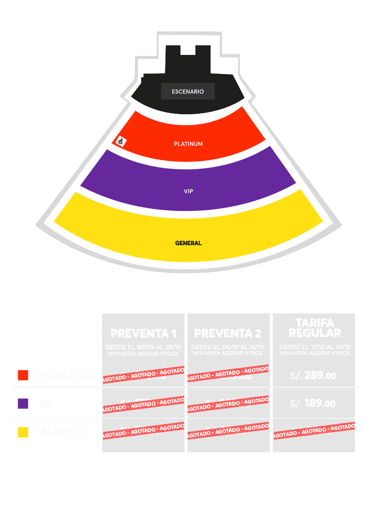 - De acuerdo con la Ley N° 29973, las personas con discapacidad debidamente acreditadas podrán acceder a un descuento para la compra de su entrada. Este descuento es válido únicamente para una (01) entrada por usuario, de carácter personal e intransferible. Para solicitarlo y conocer más sobre el procedimiento de compra, ingresa a: Fan Support y/o acércate a nuestro centros de experiencia.