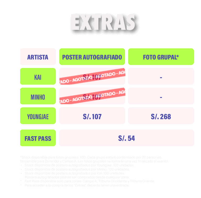 - Zona Idol Vip Package Izq/Der/Ctrl, Incluye: Soundcheck, poster oficial, lanyard & Pass, Fast pass, Acceso a feria K, Acceso a zonas de expeririencia, Merch (Y-shirt de cortesia), Zona de descanso. entrega de productos en el local, el dia del evento.
