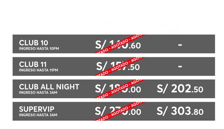 - Capacidad Preventa Exclusiva: Club All Night (500), Super Vip (100).