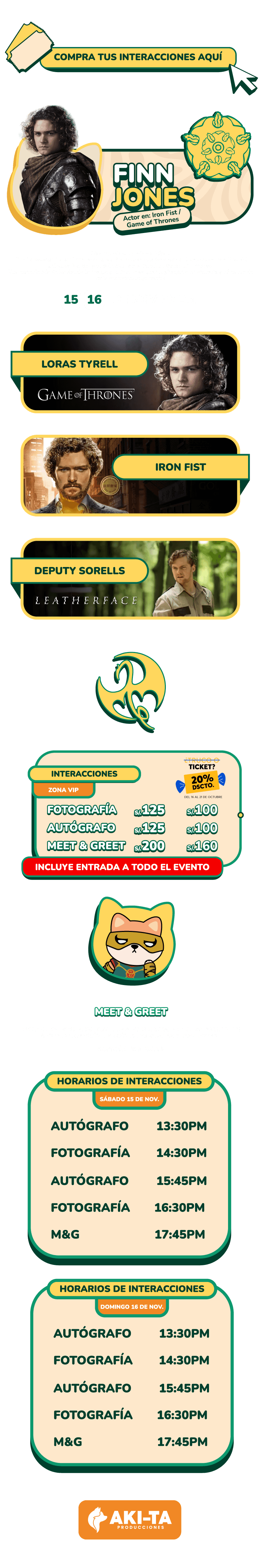 • Promoción Truco o Ticket vigente desde el 16 de octubre a las 17:00 horas hasta el 21 de octubre a las 23:59 horas de 2025. Descuento 20% en fotografía, autógrafo y meet & greet. Stock máximo de la promoción: 100 interacciones por tipo. El descuento es sobre la tarifa regular y no aplica a otros descuentos o promociones. Promoción válida con cualquier método de pago.