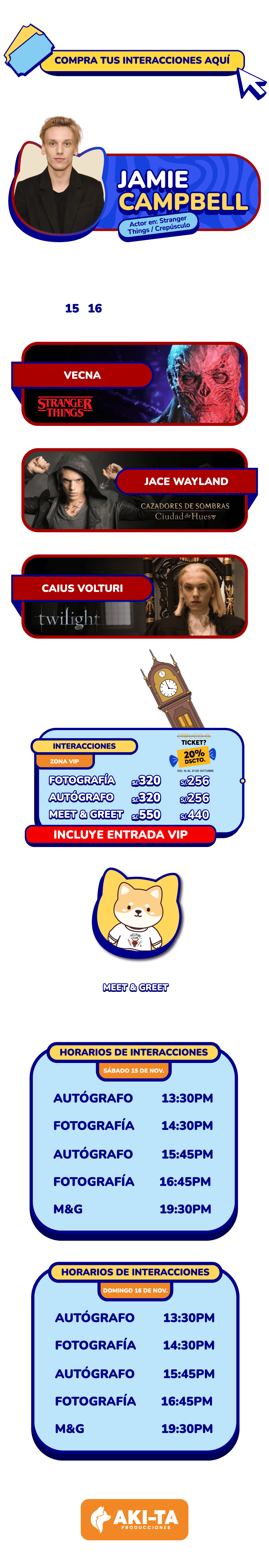 - Promoción Truco o Ticket vigente desde el 16 de octubre a las 17:00 horas hasta el 21 de octubre a las 23:59 horas de 2025. Descuento 20% en fotografía, autógrafo y meet & greet. Stock máximo de la promoción: 100 interacciones por tipo. El descuento es sobre la tarifa regular y no aplica a otros descuentos o promociones. Promoción válida con cualquier método de pago.