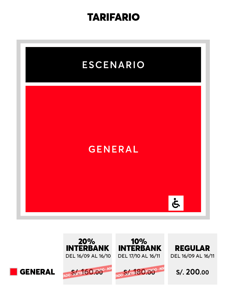 - Condiciones INTERBANK: Válida para Tarjetas de Crédito y Débito Interbank. Excepto Tarjetas Empresariales ni Rappicard. Válido para comprar en la web https://www.ticketmaster.pe/. Hasta -20% de dscto con Interbank del 16 de setiembre al 16 de octubre de 2025 o o hasta agotar stock. Los precios incluyen comisión de Ticketmaster. El desarrollo del evento es responsabilidad del organizador. Interbank no será responsable por cualquier eventualidad que impida la realización del evento o cualquier reclamo en general. Consulta tasas de interés, comisiones, gastos y penalidades en el Tarifario, en Tiendas Interbank o en www.interbank.pe, conforme a la normativa vigente.