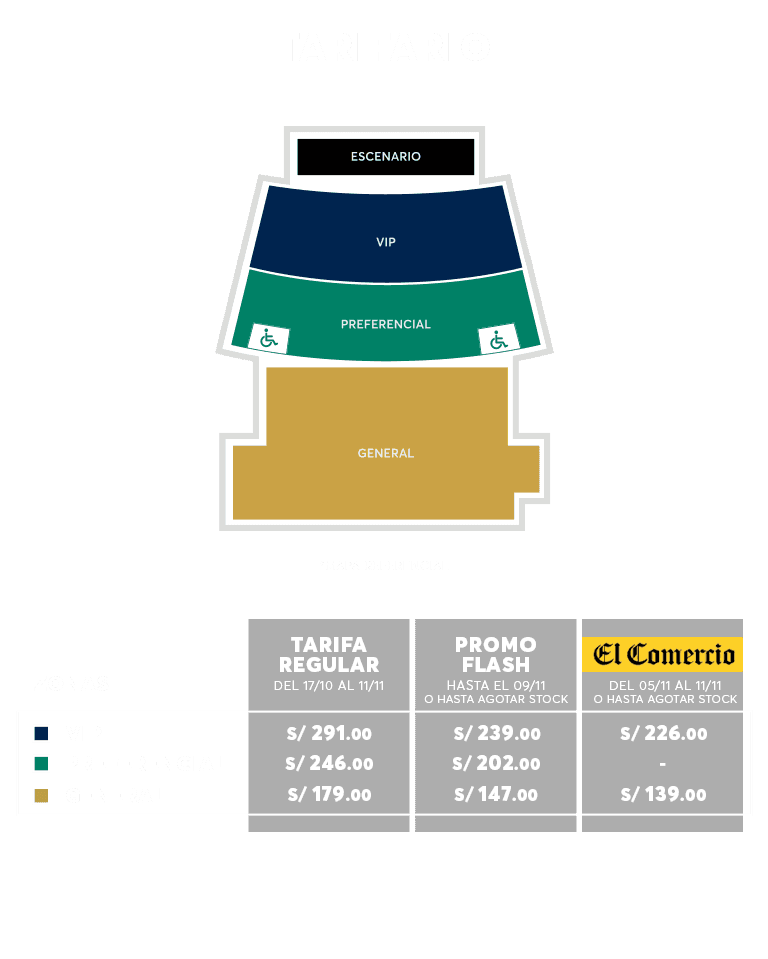 • De acuerdo con la Ley N° 29973, las personas con discapacidad debidamente acreditadas podrán acceder a un descuento para la compra de su entrada. Este descuento es válido únicamente para una (01) entrada por usuario, de carácter personal e intransferible. Para solicitarlo y conocer más sobre el procedimiento de compra, ingresa a: Fan Support y/o acércate a nuestro centros de experiencia. El descuento podrá ser adquirido por la persona debidamente acreditada, mostrando el medio probatorio correspondiente, al momento de la compra y al ingreso del evento.