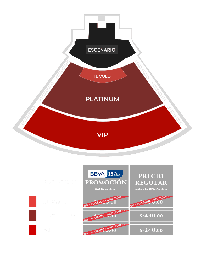 - Preventa 15% Dscto: Preventa exclusiva del 23 al 27 de diciembre del 2024 y/o hasta agotar stock. Stock máximo 1,800 entradas, distribuidas de la siguiente manera: Il Volo (250) Platinum (775), Vip (775). 15% de descuento en las entradas del concierto de Il Volo para pagos con Tarjeta de Crédito y Débito del BBVA. El descuento es aplicado al valor de la entrada mas no a la comisión de ticketera. Válido para compras online en ticketmaster.pe Precios publicados en la web de Ticketmaster. Fecha y lugar de evento: 18 de octubre del 2025, en Anfiteatro del Parque de la Exposición. Evento para mayores de 18 años. Compra máxima por persona: 6 tickets. Una producción de SHOWS & SPORTS ENTERTAINMENT S.A.C. - RUC: 20612150169. Los precios incluyen comisión de ticketera e impuestos de ley. El desarrollo del evento es responsabilidad del organizador, BBVA actúa como intermediario, por lo que no tendrá responsabilidad legal por cualquier daño o perjuicio, así como cualquier eventualidad que impida la realización.