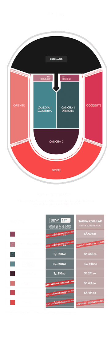 - Preventa exclusiva del 30 de junio (10:00am) al 02 de julio (09:00 am) de 2025 y/o hasta agotar stock.15% de descuento en las entradas al concierto de Imagine Dragons para pagos con Tarjeta de Crédito y Débito del BBVA. Stock 19,500 entradas, distribuidas de la siguiente manera: Cancha 1 Izquierda (4,000), Cancha 1 Derecha (4,000), Cancha 2 (5,000), Oriente (3,500), Occidente (3,000) y Tribuna Norte (3,000). El descuento es aplicado al valor de la entrada más no a la comisión de ticketera. Stock 1,000 entradas a precio regular, disponibles en preventa para pagos con Tarjeta de Crédito y Débito del BBVA, distribuidas de la siguiente manera: Pit Derecho (500) y Pit Izquierdo (500). Válido para compras online en https://www.ticketmaster.pe/. Precios publicados en la web de Ticketmaster. Fecha de evento: 19 de octubre de 2025, en el Estadio San Marcos, Lima. Una producción de Live Nation Perú S.A.C. - RUC: 20601156980. Compra máxima por persona: 6 entradas. Los precios incluyen comisión de ticketera e impuestos de ley. Ingresan a partir de los 7 años, acompañados de un adulto responsable de su seguridad, cada uno con su entrada en el mismo sector. El desarrollo del evento es responsabilidad del organizador, BBVA actúa como intermediario, por lo que no tendrá responsabilidad legal por cualquier daño o perjuicio, así como cualquier eventualidad que impida la realización.