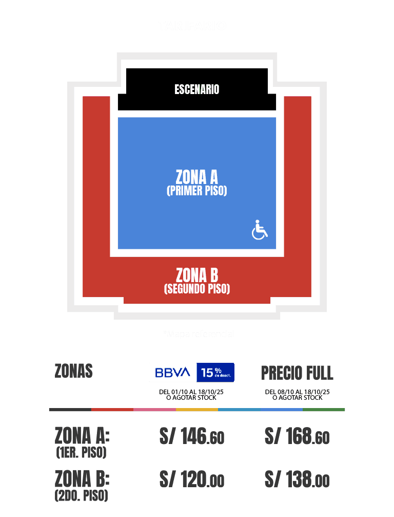 - De acuerdo con la Ley N° 29973, las personas con discapacidad debidamente acreditadas podrán acceder a un descuento para la compra de su entrada. Este descuento es válido únicamente para una (01) entrada por usuario, de carácter personal e intransferible. Para solicitarlo y conocer más sobre el procedimiento de compra, ingresa a: Fan Support y/o acércate a nuestro centros de experiencia. El descuento podra ser adquirido por la persona debidamente acreditada, mostrando el medio probatorio correspondiente, al momento de la compra y al ingreso del evento.