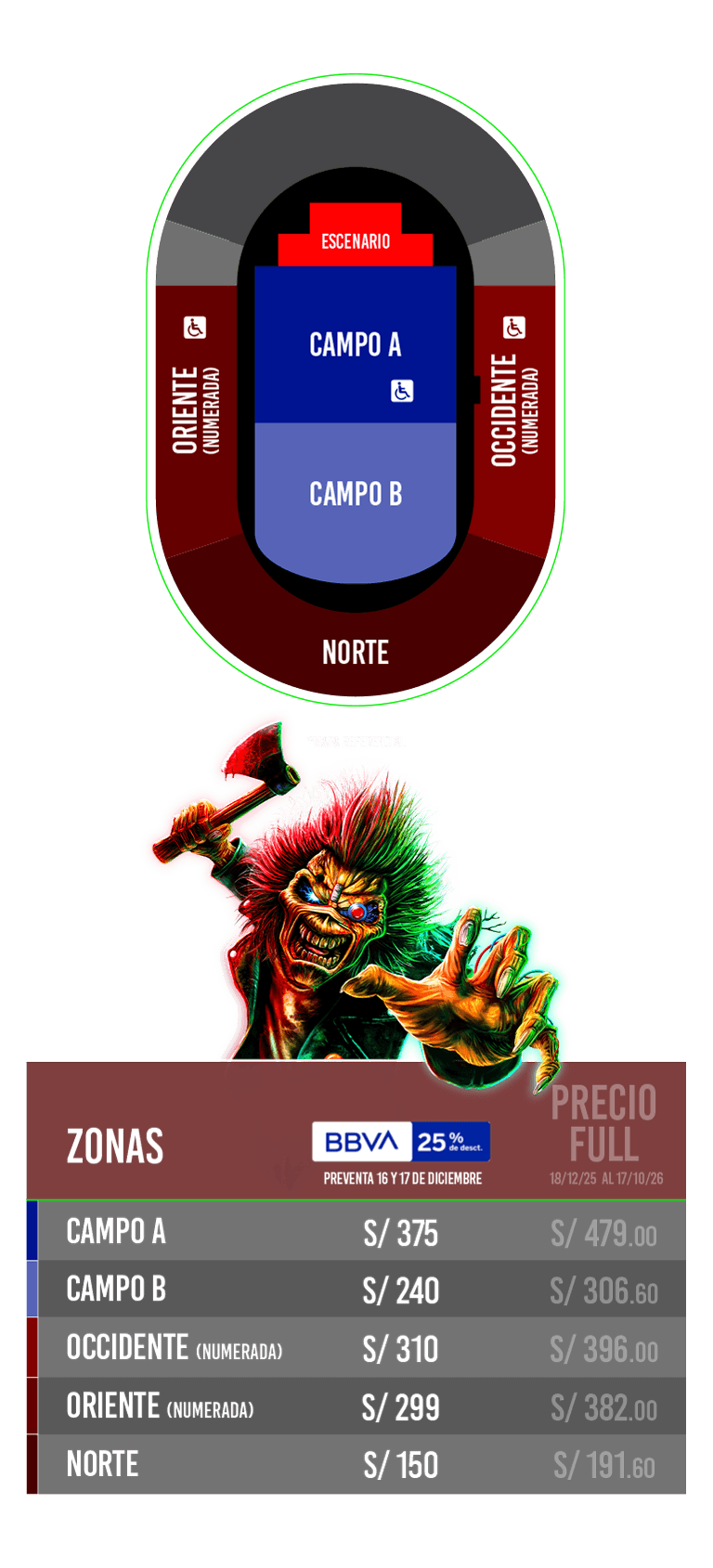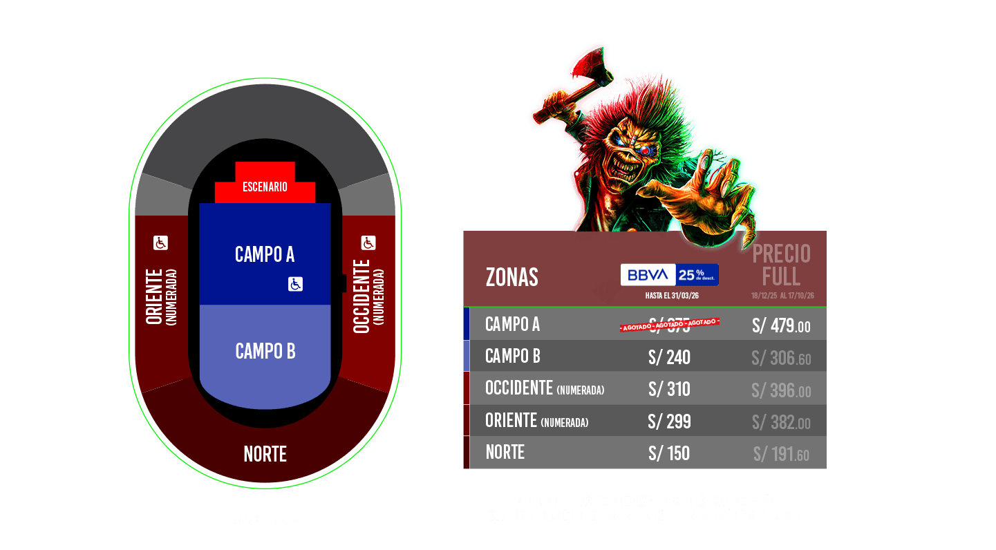 - Preventa exclusiva el 16 y 17 de diciembre de 2025 y/o hasta agotar stock. 25% de descuento en las entradas al concierto de Iron Maiden para pagos con Tarjeta de Crédito y Débito BBVA. Stock 22,720 entradas, distribuidas de la siguiente manera: Campo A (6,500), Campo B (5,000), Occidente (2,820), Oriente (3,150), Norte (5,250). Válido para compras online en https://www.ticketmaster.pe/ y en centros de experiencia Ticketmaster. Precios publicados en la web de Ticketmaster. Fecha y lugar del evento: sábado 17 de octubre de 2026, en el estadio Nacional, Lima. Compra máxima por persona: 6 entradas. El descuento no es acumulable con otras promociones. Una producción de E2 LIVE S.A.C. RUC: 20544553055. Ingresan a partir de los 4 años, acompañados de un adulto responsable de su seguridad, cada uno con su entrada en el mismo sector. Los precios incluyen comisión de ticketera e impuestos de ley. El desarrollo del evento es responsabilidad del organizador, BBVA actúa como intermediario, por lo que no tendrá responsabilidad legal por cualquier daño o perjuicio, así como cualquier eventualidad que impida la realización.