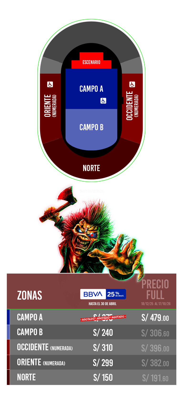 - Preventa exclusiva el 16 y 17 de diciembre de 2025 y/o hasta agotar stock. 25% de descuento en las entradas al concierto de Iron Maiden para pagos con Tarjeta de Crédito y Débito BBVA. Stock 22,720 entradas, distribuidas de la siguiente manera: Campo A (6,500), Campo B (5,000), Occidente (2,820), Oriente (3,150), Norte (5,250). Válido para compras online en https://www.ticketmaster.pe/ y en centros de experiencia Ticketmaster. Precios publicados en la web de Ticketmaster. Fecha y lugar del evento: sábado 17 de octubre de 2026, en el estadio Nacional, Lima. Compra máxima por persona: 6 entradas. El descuento no es acumulable con otras promociones. Una producción de E2 LIVE S.A.C. RUC: 20544553055. Ingresan a partir de los 4 años, acompañados de un adulto responsable de su seguridad, cada uno con su entrada en el mismo sector. Los precios incluyen comisión de ticketera e impuestos de ley. El desarrollo del evento es responsabilidad del organizador, BBVA actúa como intermediario, por lo que no tendrá responsabilidad legal por cualquier daño o perjuicio, así como cualquier eventualidad que impida la realización.