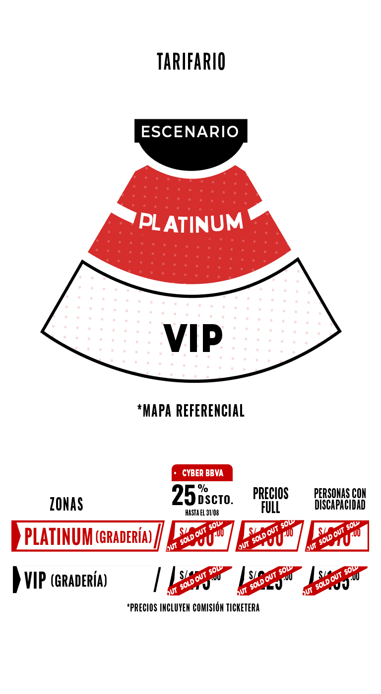 - Condiciones: Preventa exclusiva del 23 al 25 de mayo de 2025 y/o hasta agotar stock. 15% de descuento en las entradas para el concierto de Jesse & Joy para pagos con Tarjeta de Crédito y Débito del BBVA. Stock 1,850 entradas , distribuidas de la siguiente manera: Platinum (950) y VIP (900). El descuento es aplicado al valor de la entrada mas no a la comisión de ticketera. Válido para compras online en ticketmaster.pe. Precios publicados en la web de Ticketmaster. Fecha y lugar de evento: 16 de octubre de 2025, en el Anfiteatro del parque de la exposición. Compra máxima por persona: 6 tickets . Ingresan a partir de los 5 años, acompañados de un adulto responsable de su seguridad, cada uno con su entrada en el mismo sector. Una producción de Show y Sports Entertainment S.A.C. RUC 20612150169 . Los precios incluyen comisión de ticketera e impuestos de ley. El desarrollo del evento es responsabilidad del organizador, BBVA actúa como intermediario, por lo que no tendrá responsabilidad legal por cualquier daño o perjuicio, así como cualquier eventualidad que impida la realización.