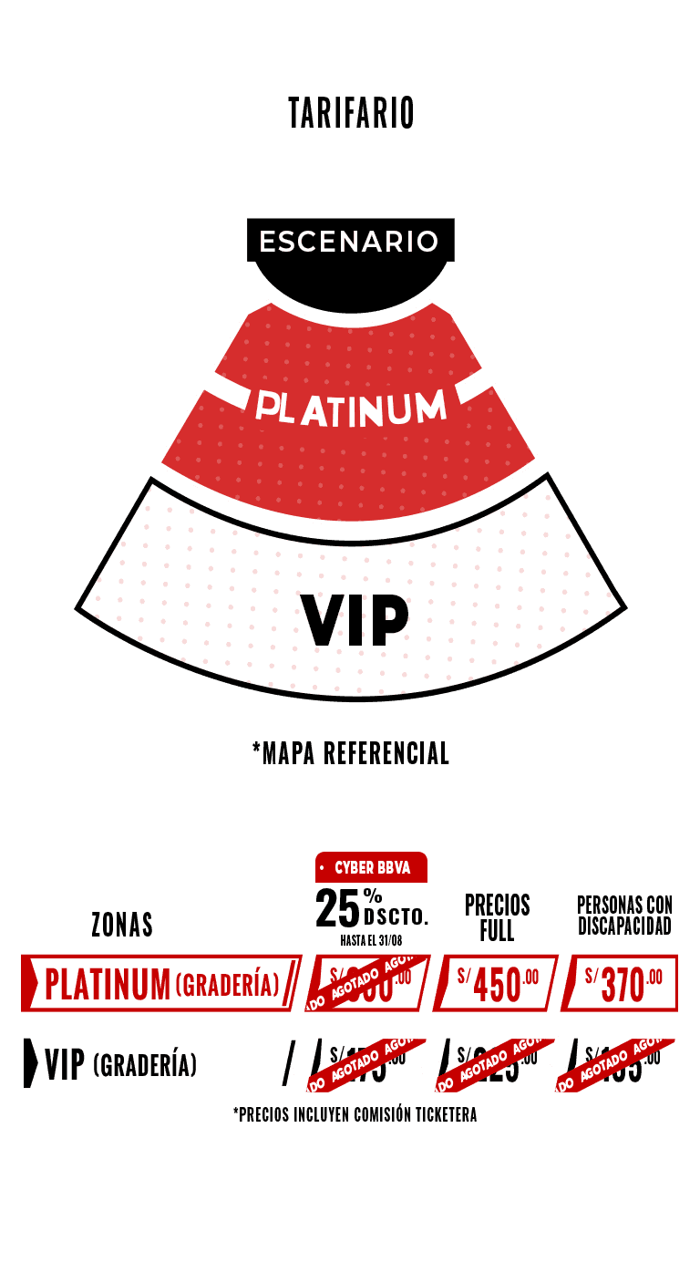 - Condiciones: Preventa exclusiva del 23 al 25 de mayo de 2025 y/o hasta agotar stock. 15% de descuento en las entradas para el concierto de Jesse & Joy para pagos con Tarjeta de Crédito y Débito del BBVA. Stock 1,850 entradas , distribuidas de la siguiente manera: Platinum (950) y VIP (900). El descuento es aplicado al valor de la entrada mas no a la comisión de ticketera. Válido para compras online en ticketmaster.pe. Precios publicados en la web de Ticketmaster. Fecha y lugar de evento: 16 de octubre de 2025, en el Anfiteatro del parque de la exposición. Compra máxima por persona: 6 tickets . Ingresan a partir de los 5 años, acompañados de un adulto responsable de su seguridad, cada uno con su entrada en el mismo sector. Una producción de Show y Sports Entertainment S.A.C. RUC 20612150169 . Los precios incluyen comisión de ticketera e impuestos de ley. El desarrollo del evento es responsabilidad del organizador, BBVA actúa como intermediario, por lo que no tendrá responsabilidad legal por cualquier daño o perjuicio, así como cualquier eventualidad que impida la realización.