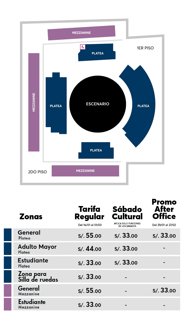 • Tarifa adulto mayor: Aplicable para personas mayores de 60 años, mostrando su DNI en físico al ingreso de la función.