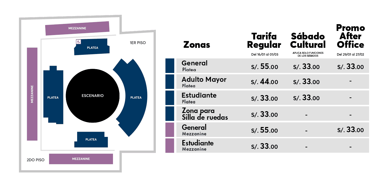 - Tarifa adulto mayor: Aplicable para personas mayores de 60 años, mostrando su DNI en físico al ingreso de la función.