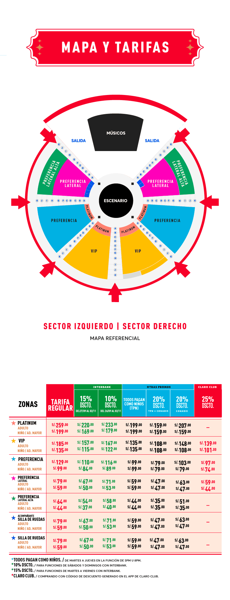 - Claro Club: Descuento aplica para funciones de martes a jueves de la segunda y tercera semana / 26 y 27 octubre a las 8:00 pm. Para aplicar el descuento, el cliente deberá incluir el código que figura en el app de Claro Club. Descuentos aplica para las zonas: Vip, preferencia y preferencia lateral, Stock Limitado.