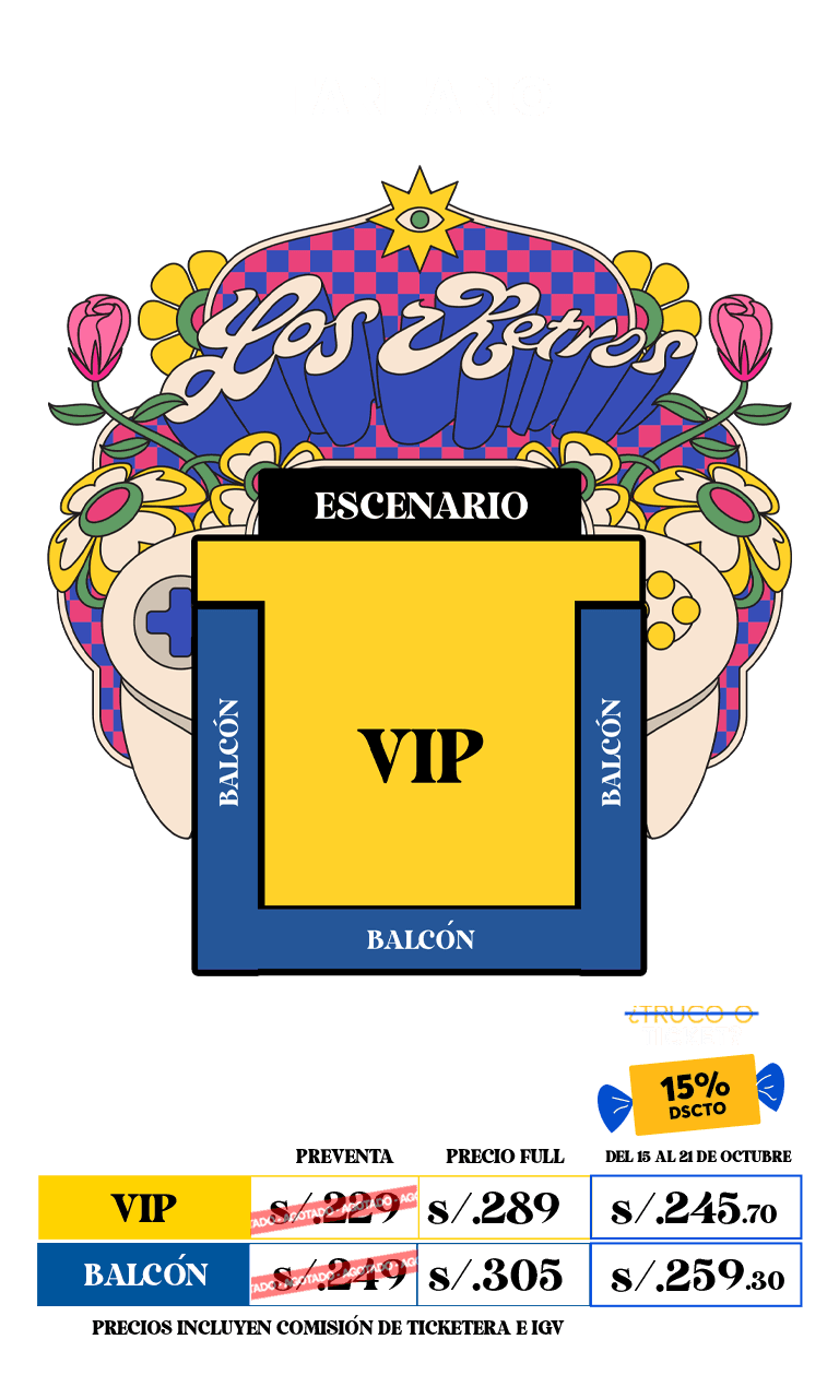 - Promoción truco o ticket vigente desde el 15 de octubre a las 10:00 hasta el 21 de octubre a las 23:59 de 2025. Descuento del 15% en sector(es) VIP y BALCON. El descuento no aplica a comisión de ticketera. Stock máximo de la promoción: 300 entradas. Válido para compras vía web y presencial. Válido con cualquier medio de pago. El descuento es sobre la tarifa regular y no aplica a otros descuentos o promociones.