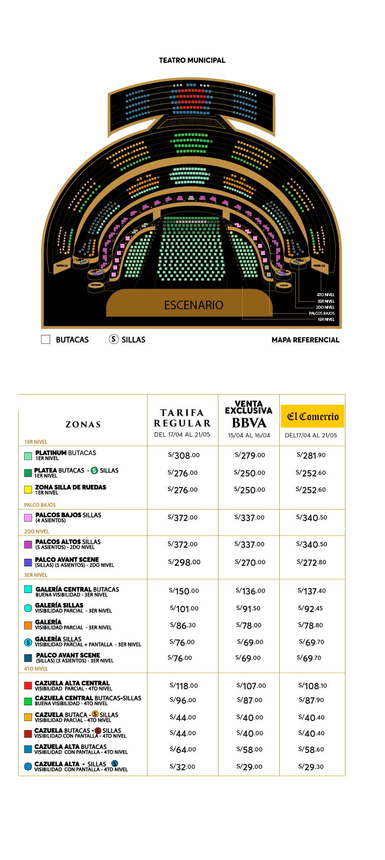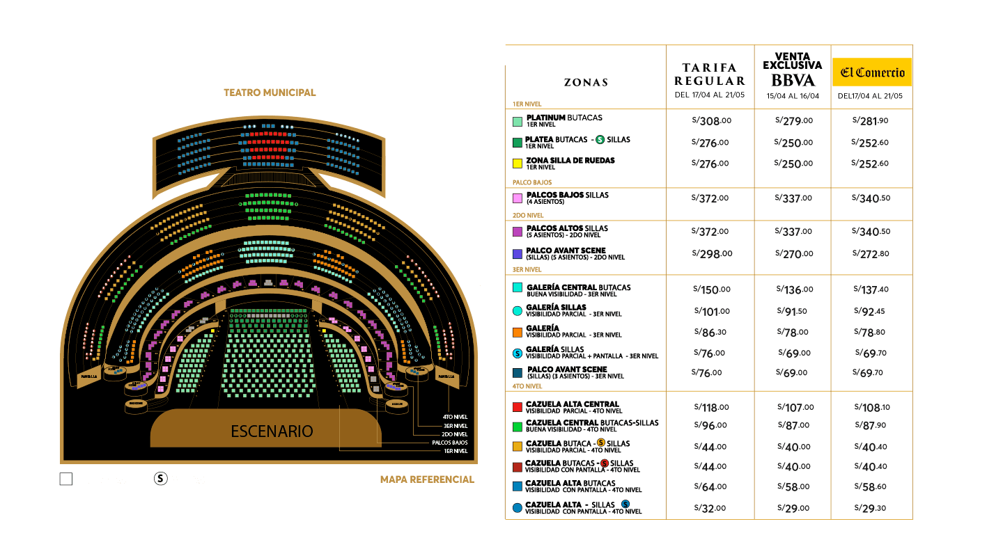 - Condiciones: Preventa exclusiva el 15 y 16 de abril de 2026 y/o hasta agotar stock. 10% de descuento en las entradas al concierto de Midori la Leyenda del Violin para pagos con Tarjeta de Crédito y Débito BBVA. Stock 530 entradas, distribuidas de la siguiente manera: Platinum butacas: 40, Platea butacas: 50, Palcos Bajos: 30, Palcos Altos: 20, Palco Avant Scene Nivel 2: 30, Palco Avant Scene Nivel 3: 30, Galería Central: 40, Galería (naranja): 30, Galería Sillas (Celeste): 40, Cazuela Central: 60, Cazuela Butaca (parcial): 30, Cazuela Butaca (pantalla): 30, Cazuela Alta: 30 y Cazuela Alta Sillas: 30. El descuento es aplicado al valor de la entrada más no a la comisión de ticketera. Válido para compras online en https://www.ticketmaster.pe. Precios publicados en la web de Ticketmaster. Fecha del evento: 21 de Mayo de 2026, en el Teatro Municipal de Lima. Compra máxima por persona: 06 entradas. Una producción de Inversiones Procultura S.A.C. Los precios incluyen comisión de ticketera e impuestos de ley. Ingresan a partir de los 14 años, acompañados de un adulto responsable de su seguridad, cada uno con su entrada en el mismo sector. El desarrollo del evento es responsabilidad del organizador, BBVA actúa como intermediario, por lo que no tendrá responsabilidad legal por cualquier daño o perjuicio, así como cualquier eventualidad que impida la realización.