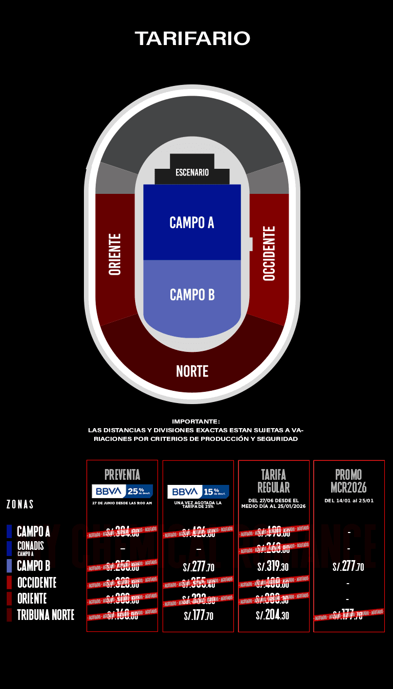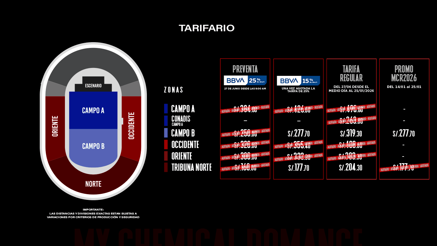 - Condiciones: Preventa exclusiva BBVA el 27 de junio de 2025 y/o hasta agotar stock. Stock 22,270 entradas distribuidas de la siguiente manera: Campo A (6,225), Campo B (4,875), Occidente (2,780), Oriente (3,140) y Norte (5,250). 25% de descuento en las entradas del concierto de My Chemical Romance para pagos con Tarjeta de Crédito y Débito BBVA. Una vez agotado el stock de entradas con el 25% de descuento, se activará inmediatamente un 15% de descuento con Tarjetas de Crédito y Débito BBVA. El descuento es aplicado al valor de la entrada mas no a la comisión de ticketera. Válido para compras online en https://www.ticketmaster.pe/. Precios publicados en la web de Ticketmaster. Fecha y lugar de evento: 25 de enero de 2026, en el Estadio Nacional, Lima. Compra máxima por persona: 6 tickets. Una producción de E2 LIVE S.A.C. RUC: 20544553055. Los precios incluyen comisión de ticketera e impuestos de ley. El desarrollo del evento es responsabilidad del organizador, BBVA actúa como intermediario, por lo que no tendrá responsabilidad legal por cualquier daño o perjuicio, así como cualquier eventualidad que impida la realización.