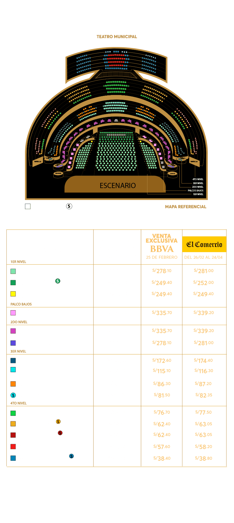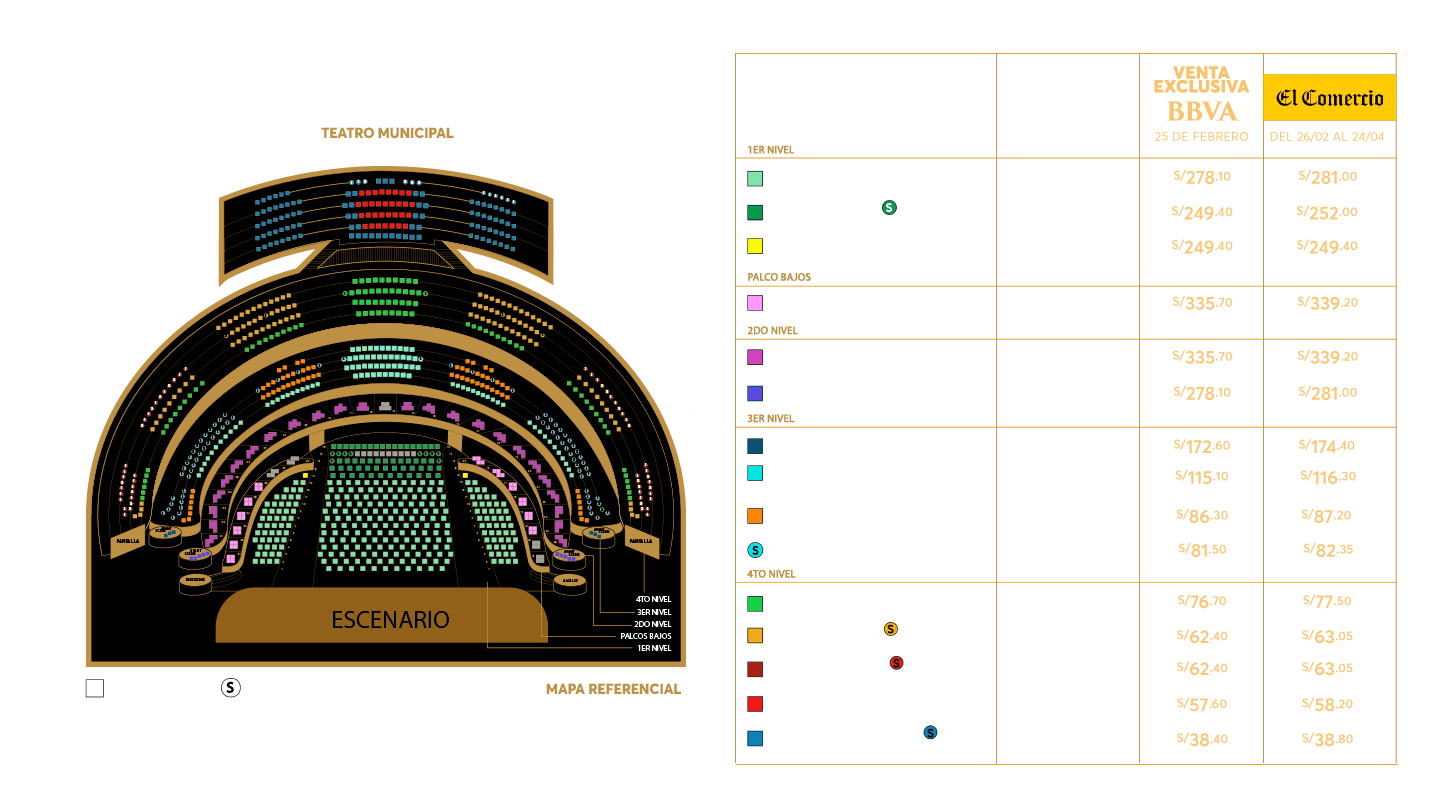 - Condiciones: Preventa exclusiva el 25 y 26 de febrero de 2026 y/o hasta agotar stock. 10% de descuento en las entradas al concierto de Rafael Aguirre - La Sensación mundial de la Guitarra Clásica para pagos con Tarjeta de Crédito y Débito BBVA. Stock 530 entradas, distribuidas de la siguiente manera: Platinum butacas: 40, Platea butacas: 50, Palcos Bajos: 30, Palcos Altos: 20, Palco Avant Scene Nivel 2: 30, Palco Avant Scene Nivel 3: 30, Galería Central: 40, Galería (naranja): 30, Galería Sillas (Celeste): 40, Cazuela Central: 60, Cazuela Butaca (parcial): 30, Cazuela Butaca (pantalla): 30, Cazuela Alta: 30 y Cazuela Alta Sillas: 30. El descuento es aplicado al valor de la entrada más no a la comisión de ticketera. Válido para compras online en https://www.ticketmaster.pe. Precios publicados en la web de Ticketmaster. Fecha del evento: 22 de Abril de 2026, en el Teatro Municipal de Lima. Compra máxima por persona: 06 entradas. Una producción de Inversiones Procultura S.A.C. Los precios incluyen comisión de ticketera e impuestos de ley. Ingresan a partir de los 14 años, acompañados de un adulto responsable de su seguridad, cada uno con su entrada en el mismo sector. El desarrollo del evento es responsabilidad del organizador, BBVA actúa como intermediario, por lo que no tendrá responsabilidad legal por cualquier daño o perjuicio, así como cualquier eventualidad que impida la realización.