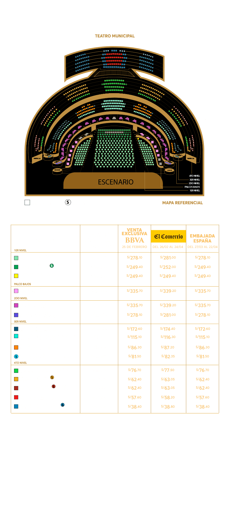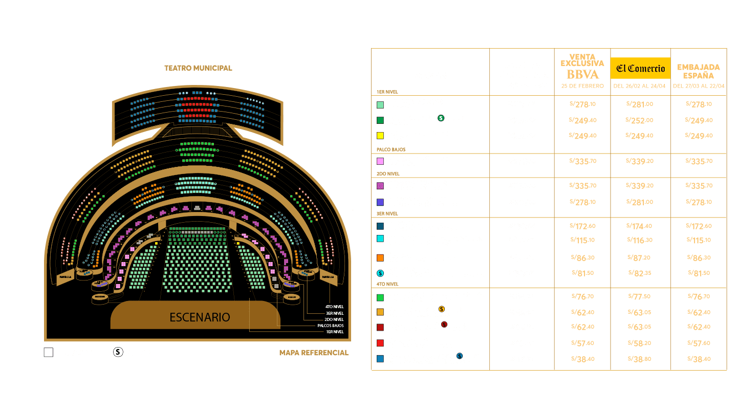 - Condiciones: Preventa exclusiva el 25 y 26 de febrero de 2026 y/o hasta agotar stock. 10% de descuento en las entradas al concierto de Rafael Aguirre - La Sensación mundial de la Guitarra Clásica para pagos con Tarjeta de Crédito y Débito BBVA. Stock 530 entradas, distribuidas de la siguiente manera: Platinum butacas: 40, Platea butacas: 50, Palcos Bajos: 30, Palcos Altos: 20, Palco Avant Scene Nivel 2: 30, Palco Avant Scene Nivel 3: 30, Galería Central: 40, Galería (naranja): 30, Galería Sillas (Celeste): 40, Cazuela Central: 60, Cazuela Butaca (parcial): 30, Cazuela Butaca (pantalla): 30, Cazuela Alta: 30 y Cazuela Alta Sillas: 30. El descuento es aplicado al valor de la entrada más no a la comisión de ticketera. Válido para compras online en https://www.ticketmaster.pe. Precios publicados en la web de Ticketmaster. Fecha del evento: 22 de Abril de 2026, en el Teatro Municipal de Lima. Compra máxima por persona: 06 entradas. Una producción de Inversiones Procultura S.A.C. Los precios incluyen comisión de ticketera e impuestos de ley. Ingresan a partir de los 14 años, acompañados de un adulto responsable de su seguridad, cada uno con su entrada en el mismo sector. El desarrollo del evento es responsabilidad del organizador, BBVA actúa como intermediario, por lo que no tendrá responsabilidad legal por cualquier daño o perjuicio, así como cualquier eventualidad que impida la realización.