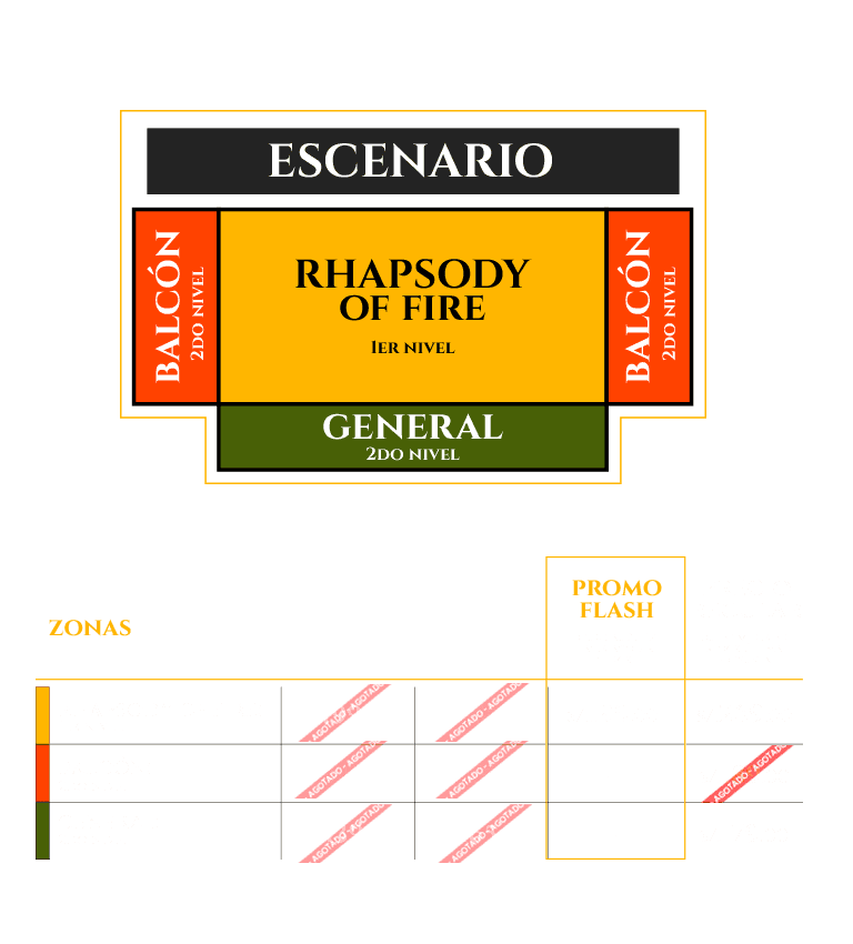 - CONADIS (Sector RHAPSODY OF FIRE): De acuerdo a lo establecido por la Ley General de la Persona con Discapacidad, el descuento podrá ser adquirido por lo registrados en el CONADIS debidamente acreditados, mostrando el certificado correspondiente. Solo 01 entrada por certificado.