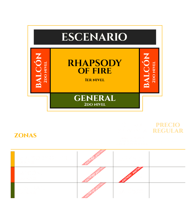 - CONADIS (Sector RHAPSODY OF FIRE): De acuerdo a lo establecido por la Ley General de la Persona con Discapacidad, el descuento podrá ser adquirido por lo registrados en el CONADIS debidamente acreditados, mostrando el certificado correspondiente. Solo 01 entrada por certificado.