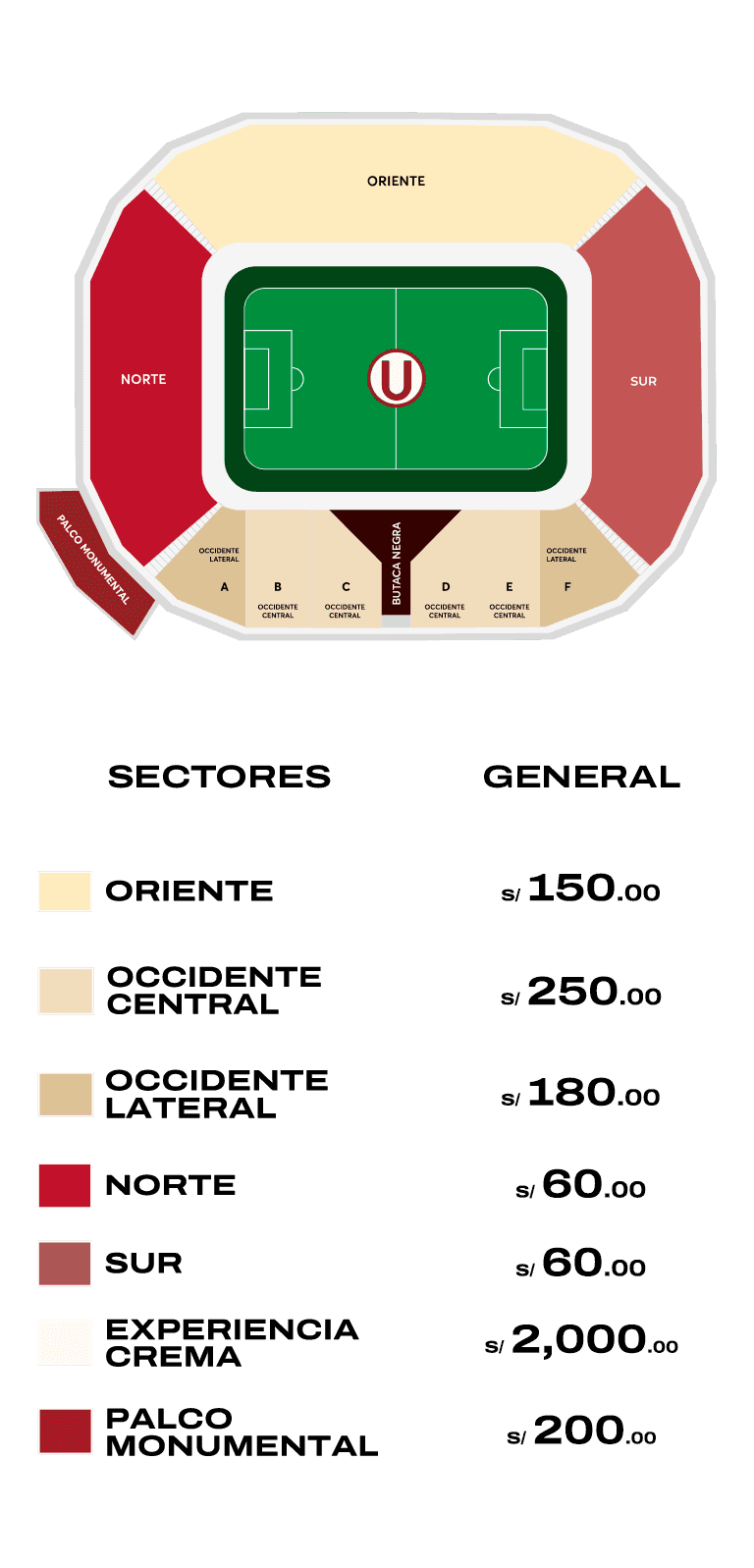 - Entrada ‘Palco Monumental’ con capacidad para 120 personas, ingreso externo por Puerta 5 e interno por Puente 3, el palco está ubicado en el primer piso en el sector de tribunas Norte con Occidente, incluye Combo Comida.