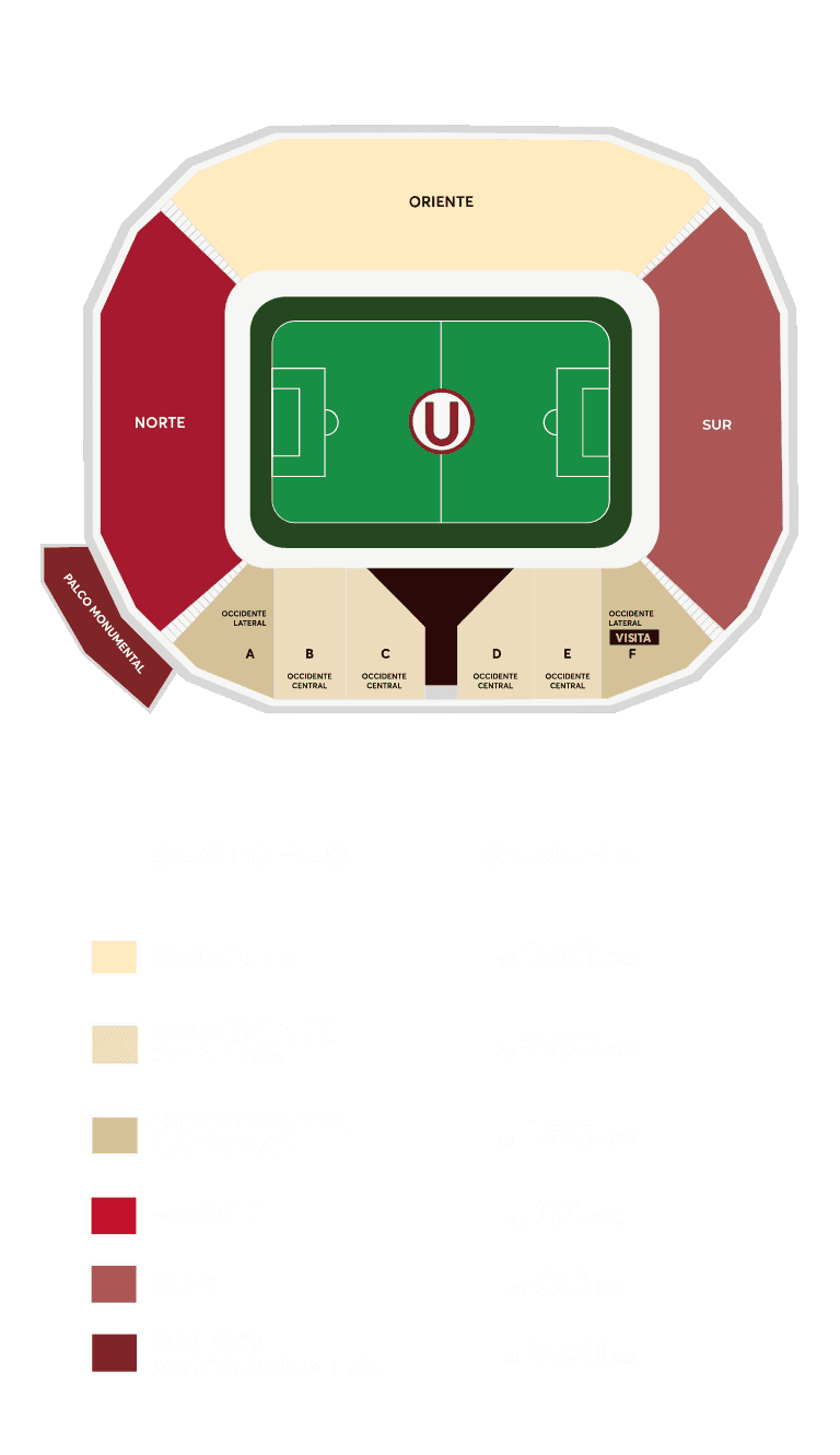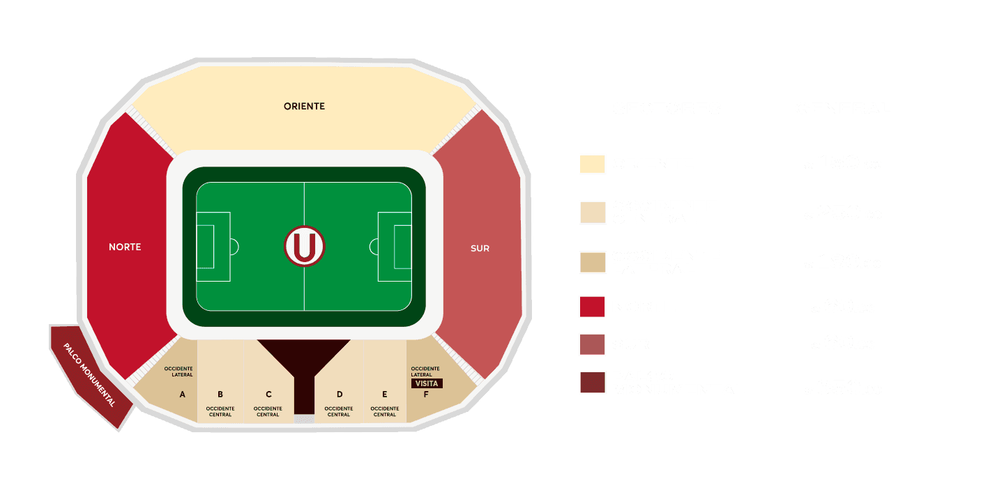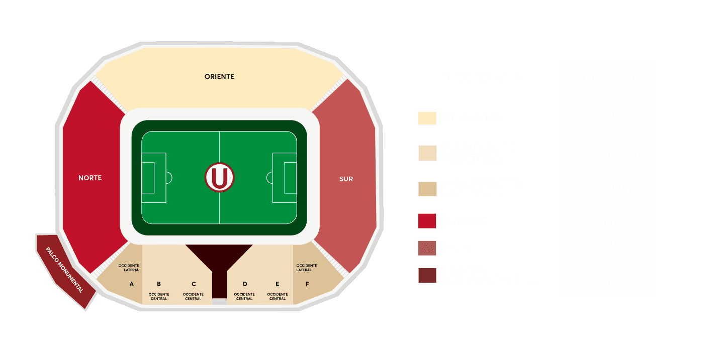 - Entrada ‘Palco Monumental’ con capacidad para 120 personas, ingreso externo por Puerta 5 e interno por Puente 3, el palco está ubicado en el primer piso en el sector de tribunas Norte con Occidente, incluye Combo Comida.