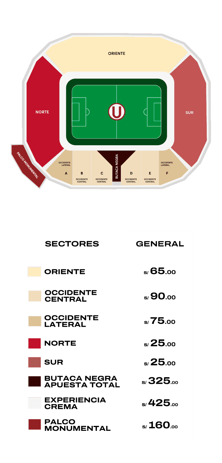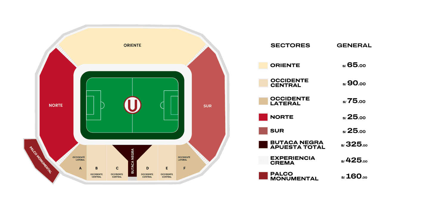 - Entrada ‘Palco Monumental’ con capacidad para 120 personas, ingreso externo por Puerta 5 e interno por Puente 3, el palco está ubicado en el primer piso en el sector de tribunas Norte con Occidente, incluye Combo Comida.