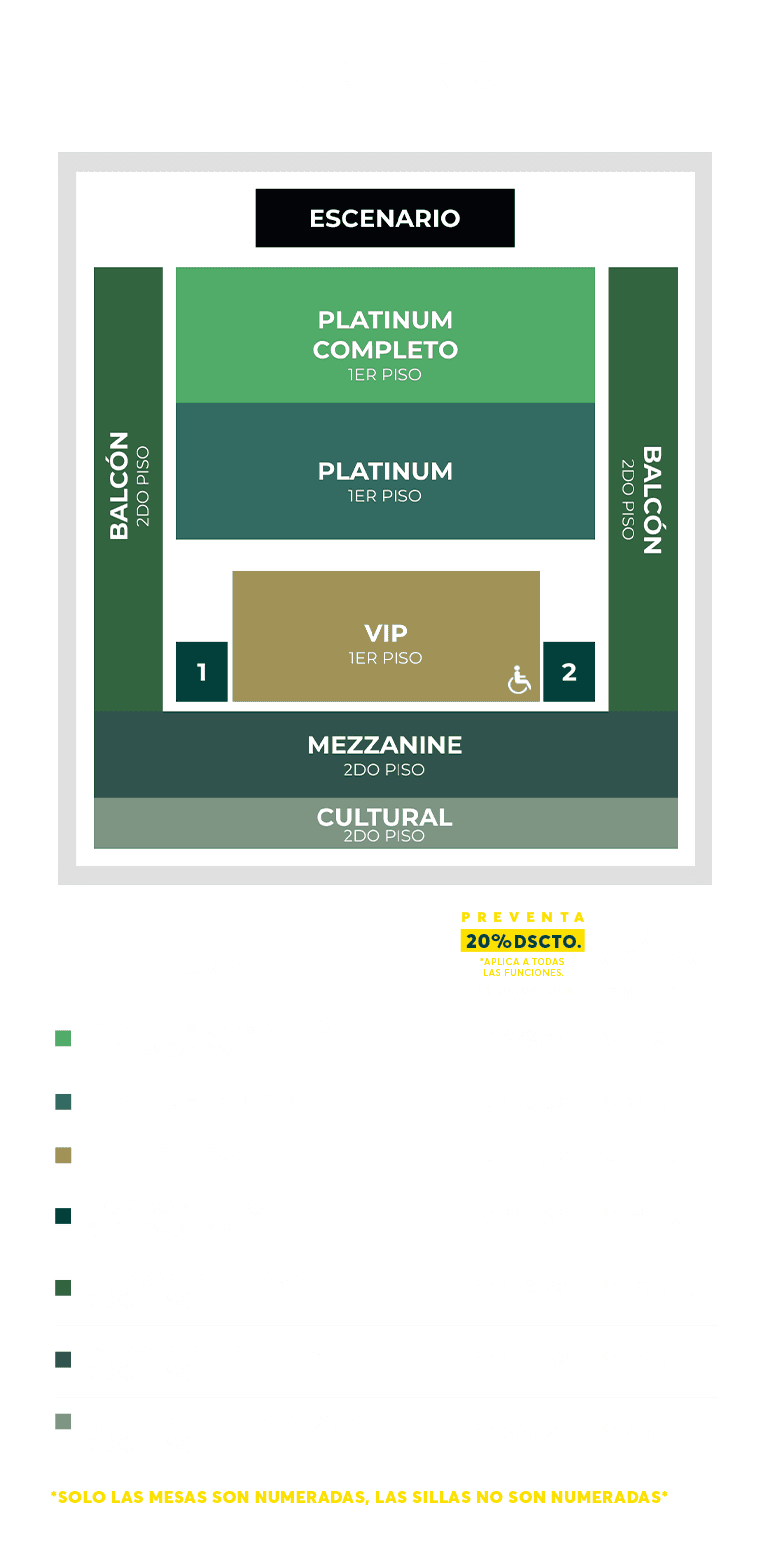 - Silla de ruedas, se ubica en el sector VIP, recomendamos adquirir las mesas 3,8,12 y 4,9,13.